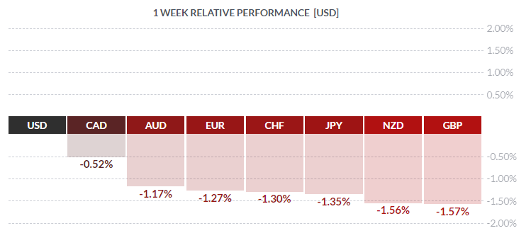 По итогам недели все основные валюты продемонстрировали снижение. Наибольший спад по отношению к доллару США показал британский фунт (-1,57%). Меньшее падение зафиксировали новозеландский доллар (-1,56%), японская иена (-1,35%), швейцарский франк (-1,30%), евро (-1,27%), австралийский доллар (-1,17%), и канадский доллар (-0,52%).