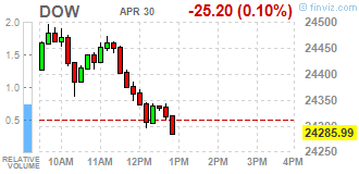 Большинство компонентов DOW в минусе (18 из 30). Лидер роста - McDonald's Corporation (MCD, +4.99%). Аутсайдер - Intel Corporation (INTC, -2.50%).