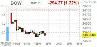 Большинство компонентов DOW в минусе (27 из 30). Лидер роста - Intel Corporation (INTC, +1.72%). Аутсайдер - Pfizer (PFE, -4.40%).