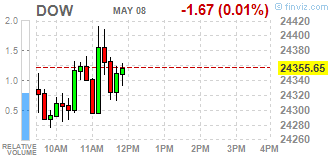 Большинство компонентов DOW в минусе (20 из 30). Лидер роста - General Electric Company (GE, +1.60%). Аутсайдер - Verizon Communications Inc. (WMT, -1.45%).