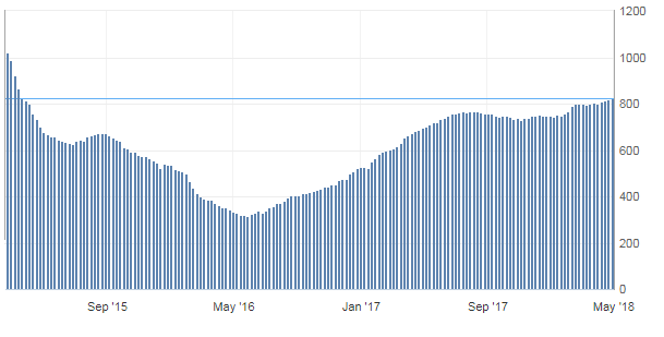 Отчет нефтесервисной компании Baker Hughes показал: с 5 по 11 мая количество активных буровых установок по добыче нефти в США увеличилось на 10 штук, до 844 единиц (самое высокое значение с середины марта 2015 года). Количество установок по добыче газа выросло на 3 штуки, составив 199 единиц. Тем временем, общее число буровых установок (газовых, нефтяных и прочих) увеличилось на 13 штук, до 1045 штук.