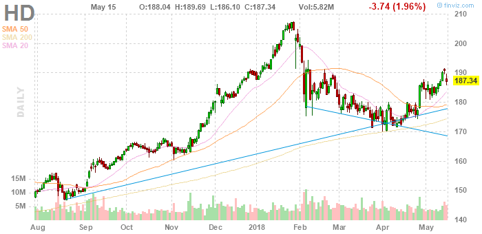 На текущий момент акции Home Depot (HD) котируются по $187,34 (-1,87%)