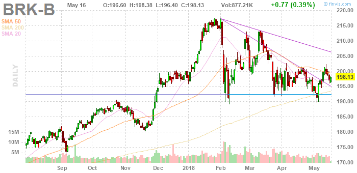 На текущий момент акции Berkshire Hathaway (BRK.B) котируются по $198,13 (+0,39%)