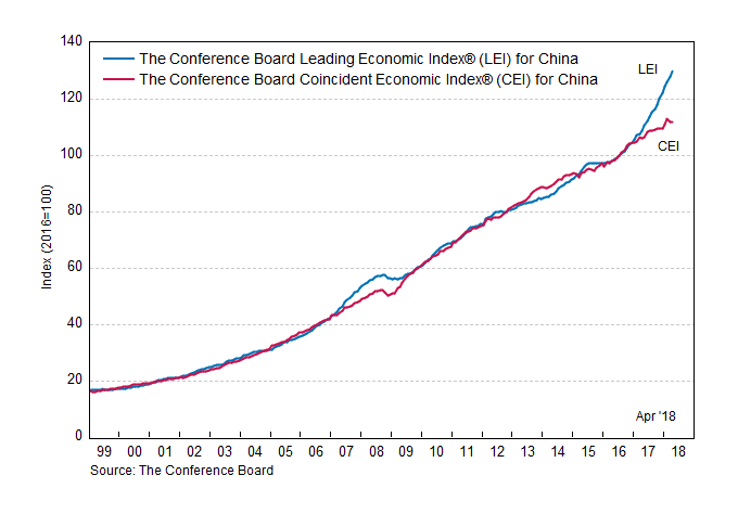 Результаты исследований, опубликованные Conference Board, показали: по итогам апреля ведущий экономический индекс (LEI) для Китая вырос на 1,5 процента, и составил 129,8 пункта (2016=100). Напомним, индекс зафиксировал повышением на 1,6 процента в марте и увеличение на 1,2 процента в феврале. В течение шести месяцев (с октября 2017 года по апрель 2018 года) показатель вырос на 10,0 процента по сравнению с повышением на 9,8 процента за предыдущий шестимесячный период (с сентября 2017 года по март 2018 года).