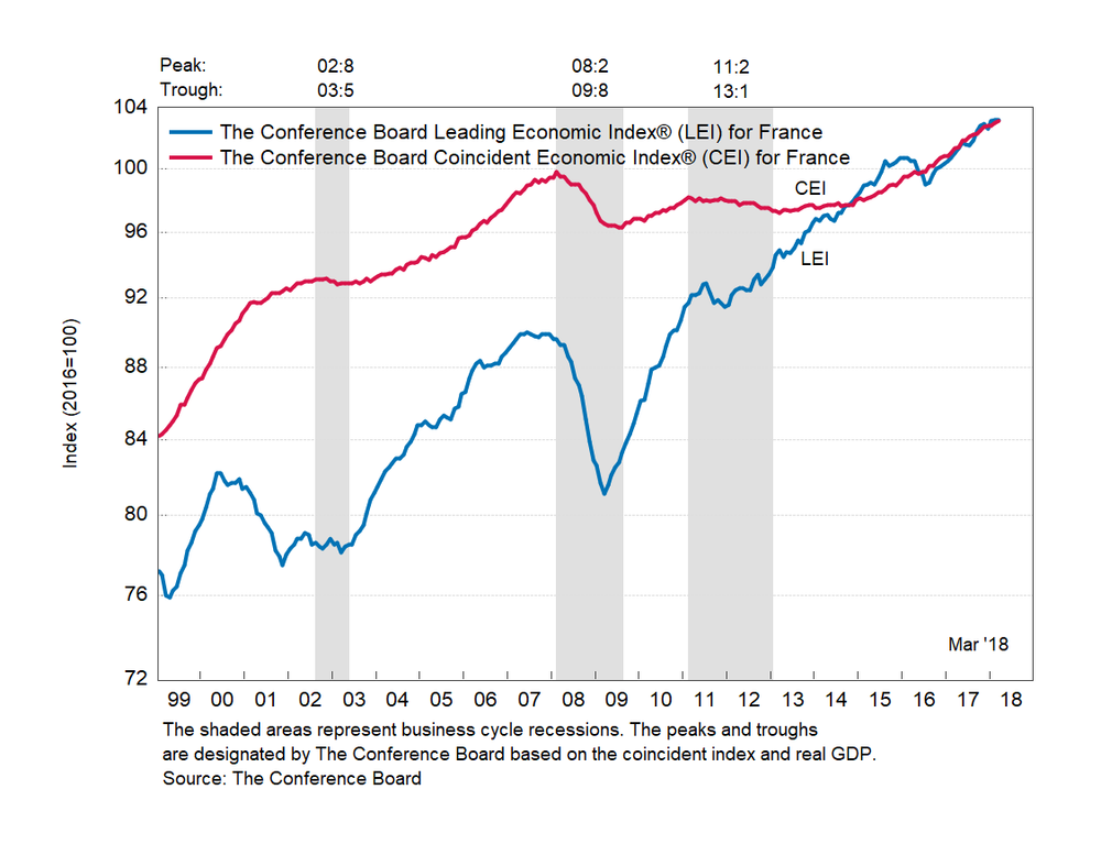 Результаты исследований, опубликованные Conference Board, показали: по итогам марта ведущий экономический индекс (LEI) для Франции не изменился, и составил 103,2 пункта (2010=100). Напомним, индекс зафиксировал повышение на 0,1 процента в феврале и прирост на 0,5 процента в январе. В течение шести месяцев (с сентября 2017 года по март 2018 года) показатель вырос на 0,7 процента по сравнению с повышением на 1,4 процента за предыдущий шестимесячный период (с августа 2017 года по февраль 2018 года).