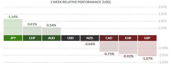 По итогам недели основные валюты продемонстрировали смешанную динамику. Укрепление по отношению к доллару США показали японская иена (+1,14%), швейцарский франк (+0,61%) и австралийский доллар (+0,54%). Падение зафиксировали новозеландский доллар (-0,06%), канадский доллар (-0,75%), евро (-0,92%) и британский фунт (-1,07%).