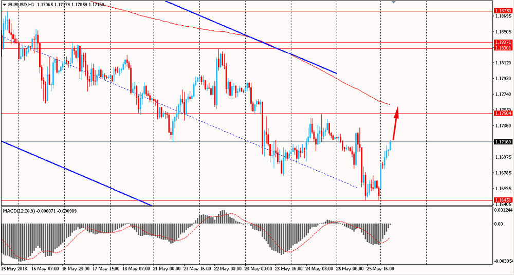 Пара EUR/USD сегодня утром выросла к $1.1715, отступив от минимумов прошлой недели. В пятницу пара снижалась, обновила недельные минимумы и закрыла день на отрицательной территории. Однако, на данный момент евро растет, корректируясь и приближаясь к линии скользящей средней MA 200 H1. Более того, подъему способствует, что на часовом графике сформировалась бычья дивергенция по индикатору MACD, что сигнализирует о возможном формирование глубокой коррекции или развороте цен.