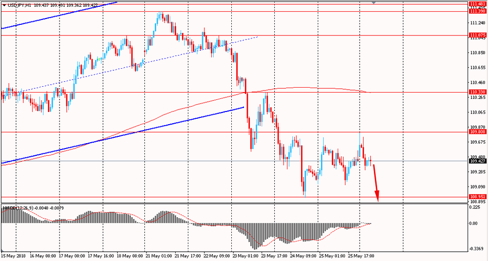 Сегодня пара USD/JPY торговалась в диапазоне Y109.30-80. В пятницу пара корректировать и весь день торговалась в диапазоне. Стоит отметить, что пара все еще находится ниже уровня скользящей средней MA 200 H1. Однако, на текущий момент пара на часовом графике сформировалась бычью дивергенция по индикатору MACD, что сигнализирует о возможном формирование глубокой коррекции или развороте цен.