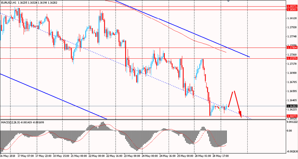 Пара EUR/USD сегодня утром торговалась в диапазоне $1.1615-35, находясь около вчерашних минимумах. В понедельник пара снижалась, обновила недельные минимумы и закрыла день на отрицательной территории. На данный момент евро находится около срединной линии глобального нисходящего тренда под полным контролем медведей. Более того, евро все еще находится ниже линии скользящей средней MA 200 H1.