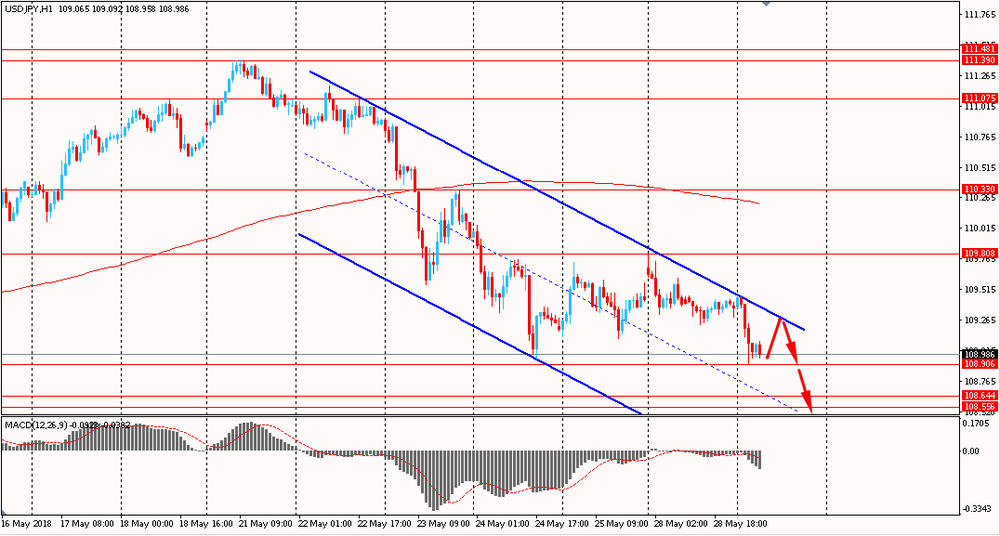 Сегодня пара USD/JPY упала к Y108.90, обновив недельные минимумы. В понедельник пара также снижалась после 2-х дневной консолидации. Стоит отметить, что пара все еще находится ниже уровня скользящей средней MA 200 H1 и находится под контролем медведей в рамках общего нисходящего канала. На данный момент пара стремится к срединной линии этого тренда.
