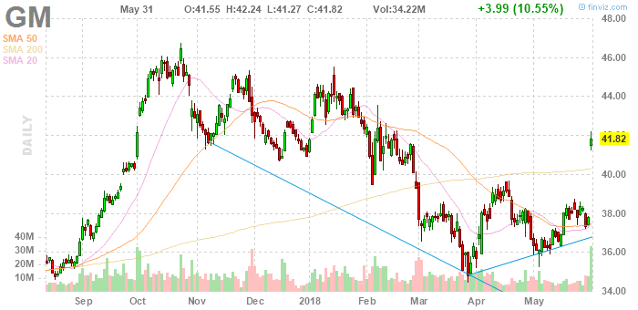 На текущий момент акции General Motors (GM) котируются по $41,82 (+10,55%)