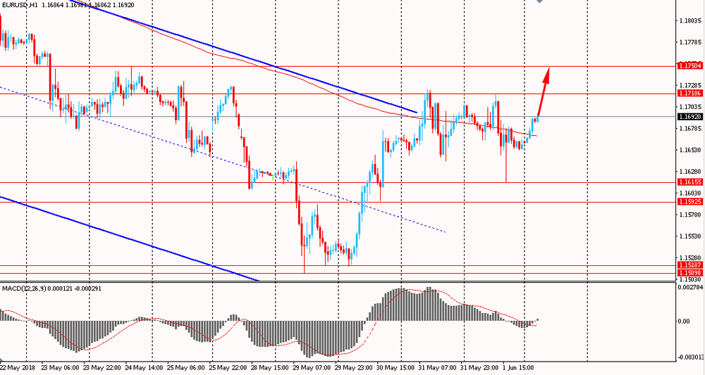 Пара EUR/USD сегодня утром выросла к $1.1695, находясь около пятничных максимумов. В конце прошлой торговой недели пара торговалась в боковом диапазоне, тестируя сопротивление глобального восходящего канала и линию скользящей средней MA 200 H1. На данный момент ситуация практически не изменилась и быки по евро все еще не отступают от намерений закрепиться выше мувинга.