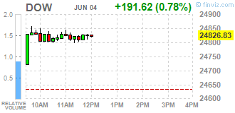 Большинство компонентов DOW в плюсе (25 из 30). Лидер роста - Walmart Inc. (WMT, +2.51). Аутсайдер - General Electric Company (GE, -0,99%).