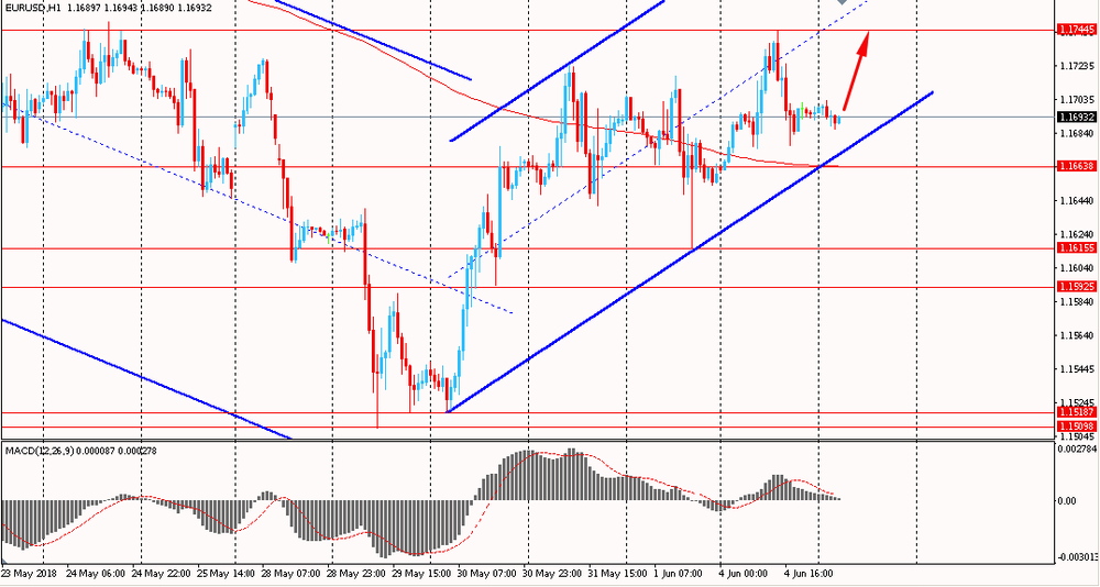 Пара EUR/USD сегодня утром торговалась в диапазоне $1.1685-05. Вчера пара выросла, обновила максимумы последних 7-ми торговых дней, и закрыла день на положительной территории. На данный момент пара торгуется выше линии скользящей средней MA 200 H1. Помимо этого евро сформировал новый восходящий канал и на текущий момент приближается к его линии поддержки.