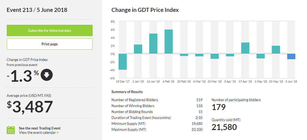 Как стало известно, стоимость молочной продукции упала на 1,3%, до $3 487 за метрическую тонну после того, как выросла на 1,9% в ходе предыдущего аукциона. Результаты аукциона также показали, что стоимость цельного сухого молока снизилась на 1,1%, до $3 205 за метрическую тонну после увеличения на 0,2% в ходе предыдущего аукциона. Тем временем, цена обезжиренного сухого молока повысилась на 0,3%, до $2 051 за метрическую тонну после того, как выросла на 3,0% в ходе предыдущего аукциона.