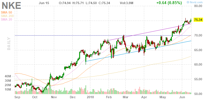 На текущий момент акции Nike (NKE) котируются по $75,34 (+0,85%)