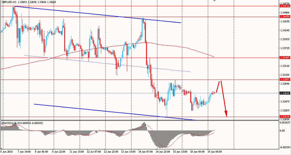 Пара GBP/USD сегодня утром немного выросла к $1.3270, восстанавливаясь после вчерашнего снижения. В понедельник пара немного снизилась, но в целом торговалась без существенных изменений. После падения 14 июня пара оттолкнувшись от наклонной линии поддержки нисходящего канала, начала восстанавливаться. На данный момент пара торгуется в глобальном нисходящем канале, ниже уровня скользящей средней MA 200 H1 и медведи сохраняют контроль над ситуацией. Однако, фунт пытается развить коррекцию и вырасти к срединной линии нисходящего тренда.