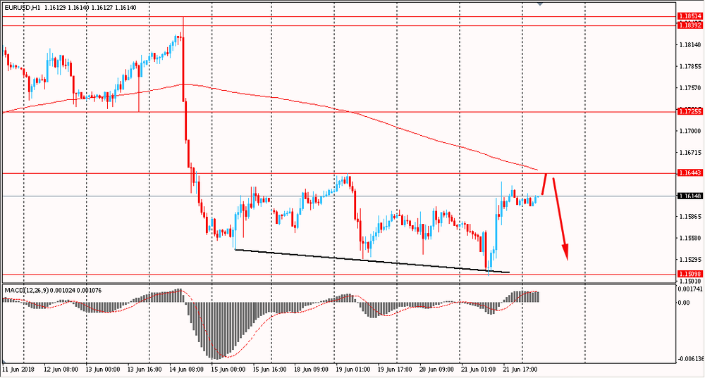 Пара EUR/USD сегодня утром торговалась в диапазоне $1.1600-15, оставаясь около вчерашних максимумов. В четверг пара оттолкнулась от наклонной линии поддержки от 15 июня и начала расти, закрыв день на положительной территории. На данный момент пара все еще торгуется ниже уровня скользящей средней MA 200 H1, однако практически приблизилась к данному мувингу.