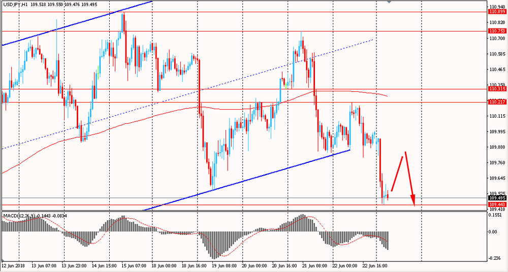 Сегодня утром пара USD/JPY резко упала к Y109.45, закрепившись ниже уровня наклонной линии восходящего канала. В пятницу пара несколько раз тестировала данный уровень, но пробить его так и не смогла. На данный момент USD/JPY по-прежнему находится ниже линии скользящей средней MA 200 H1 и вышла за рамки глобального бычьего канала. Сейчас контроль над парой имеют медведи.