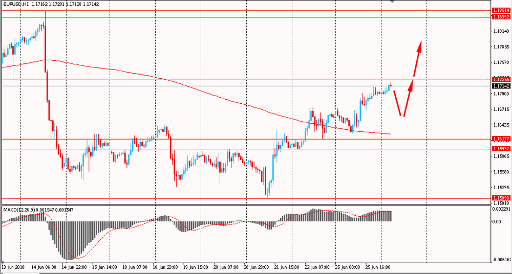 Пара EUR/USD сегодня утром торговалась в диапазоне $1.1700-20, оставаясь около вчерашних максимумов. В понедельник, как и предыдущие два дня, пара росла и сумела закрыть день в зеленой зоне. На данный момент евро закрепился выше линии скользящей средней и торгуется выше данного мувинга. Тем не менее, стоит отметить, что на часовом графике сформировалась медвежья дивергенция по индикатору MACD, что сигнализирует о возможном формирование глубокой коррекции или развороте цен.