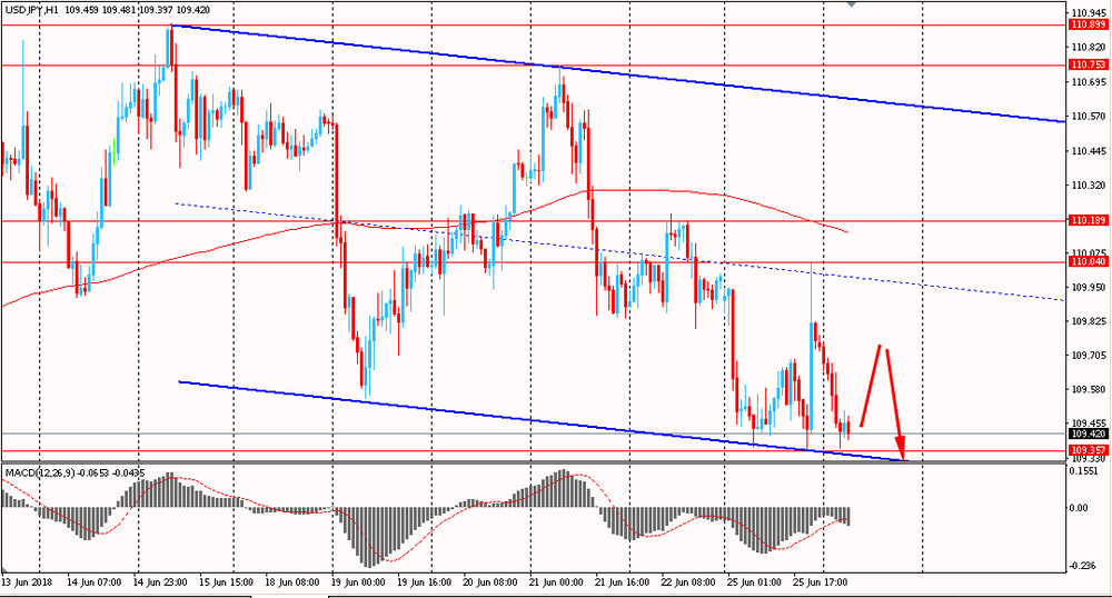 Сегодня утром пара USD/JPY резко упала к Y109.35, продолжив вчерашнее снижение. В понедельник пара, оттолкнувшись от срединной линии нисходящего канала, упала и закрыла день на отрицательной территории. На данный момент USD/JPY по-прежнему находится ниже линии скользящей средней MA 200 H1 и тестирует линию поддержки глобального нисходящего тренда. Сейчас контроль над парой имеют медведи.