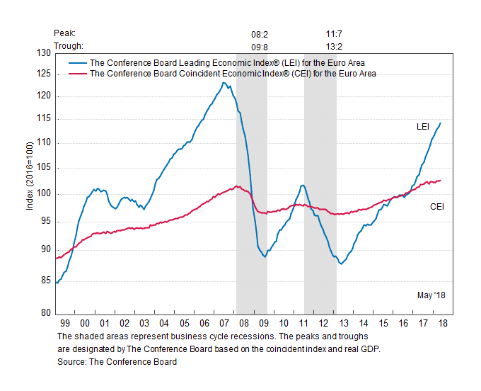Результаты исследований, опубликованные Conference Board, показали: по итогам мая ведущий экономический индекс (LEI) для еврозоны вырос на 0,6 процента, и составил 114,2 пункта (2016=100). Напомним, индекс зафиксировал повышение по 0,5 процента в апреле и марте. В течение шести месяцев (с ноября 2017 года по май 2018 года) показатель увеличился на 4,0 процента по сравнению с ростом на 4,1 процента за предыдущий шестимесячный период (с октября 2017 года по апрель 2018 года).