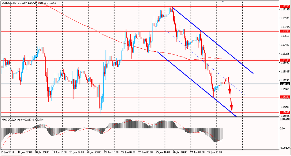 Пара EUR/USD сегодня утром торговалась в диапазоне $1.1555-70, оставаясь около вчерашних минимумов. В среду пара, оттолкнувшись от линии сопротивления нисходящего канала, упала и закрыла день существенным понижением. Евро удалось пробить линию скользящей средней MA 200 H1 и закрепиться ниже. Более того, на данный момент пара находится в общем нисходящем канале и приближается к его срединной линии. Медведи полностью перехватили инициативу и, скорее всего, продолжат свое наступление.