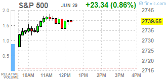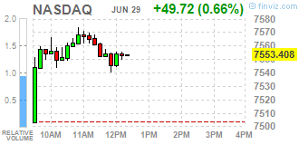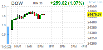 Большинство компонентов DOW в плюсе (27 из 30). Лидер роста - NIKE, Inc. (NKE, +11,85%). Аутсайдер - Verizon Communications Inc. (VZ, -0,62%).