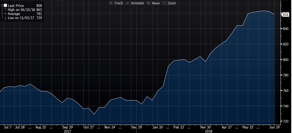 Отчет нефтесервисной компании Baker Hughes показал: с 23 по 29 июня количество активных буровых установок по добыче нефти в США снизилось на 4 штуки, составив 858 единиц Это было второе недельное падение подряд. Количество установок по добыче газа уменьшилось на 1 штуку, до 187 единиц. Общее число буровых установок (газовых, нефтяных и прочих) сократилось на 5 штук, до 1047 единиц. Это было третье недельное падение подряд.