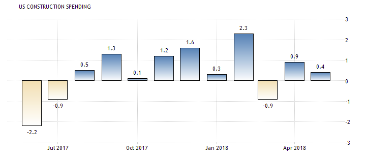 Министерство торговли сообщило, что расходы на строительство увеличились на 0,4% в мае. Данные за апрель были пересмотрены, чтобы показать, что расходы на строительство выросли на 0,9% вместо ранее заявленного повышения на 1,8%. В майском отчете правительство пересмотрело данные о расходах на строительство начиная с января 2011 года. Экономисты прогнозировали, что расходы на строительство в мае вырастут на 0,5%. Между тем, в годовом выражении расходы на строительство подскочили на 4,5%.