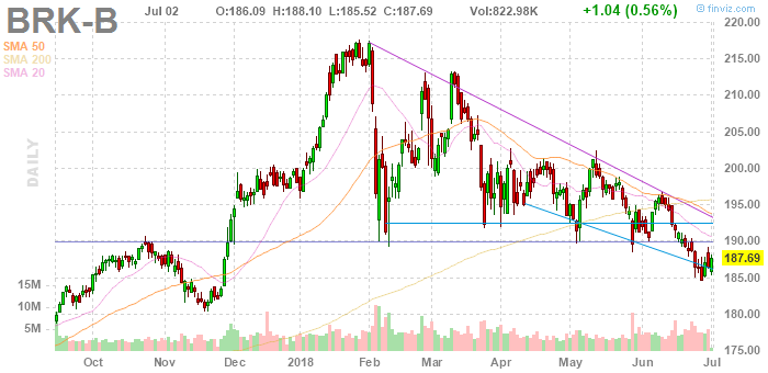 На текущий момент акции Berkshire Hathaway (BRK.B) котируются по $187,69 (+0,56%)