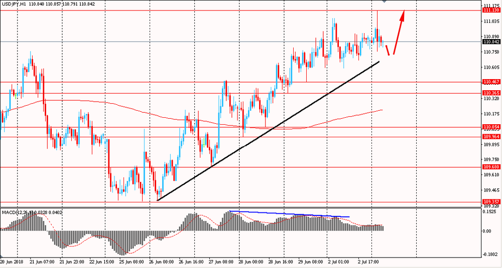 Сегодня утром пара USD/JPY выросла к Y111.10, продолжая вчерашний подъем. В понедельник пара выросла и смогла завершить очередной день на положительной территории. На данный момент USD/JPY по-прежнему торгуется выше линии скользящей средней MA 200 H1 и выше поддержки общего восходящего канала от 26 июня. Пока быки удерживают преимущество, однако, стоит отметить, что на часовом графике сформировалась медвежья дивергенция по индикатору MACD, что сигнализирует о возможном формирование глубокой коррекции или развороте цен.