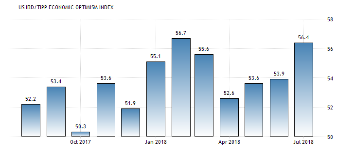 Данные показали, что индекс экономического оптимизма в США, рассчитываемый газетой Investor's Business Daily и исследовательской фирмой TechnoMetrica Institute of Policy and Politics, заметно улучшился в июле, и оказался выше прогнозов экспертов. Индекс вырос до 56,4 пункта с 53,9 пункта в июне, при этом эксперты ожидали, что он поднимется лишь до 54,2 пункта. В итоге, индекс зафиксировал третье повышение подряд и достиг второго по величине значения с октября 2004 года. Напомним, значение индекса выше 50 пунктов указывает на оптимизм. Стоит подчеркнуть, что индекс находится выше уровня 50 пунктов уже 22 месяц подряд (с октября 2016 года), что является самой длительной серией за всю историю данного исследования, то есть более чем за десятилетие. Вместе с тем, индекс сейчас находится на 7 пунктов выше своего долгосрочного среднего значения и на 12 пунктов выше показателя декабря 2007 года, когда экономика вступила в рецессию.