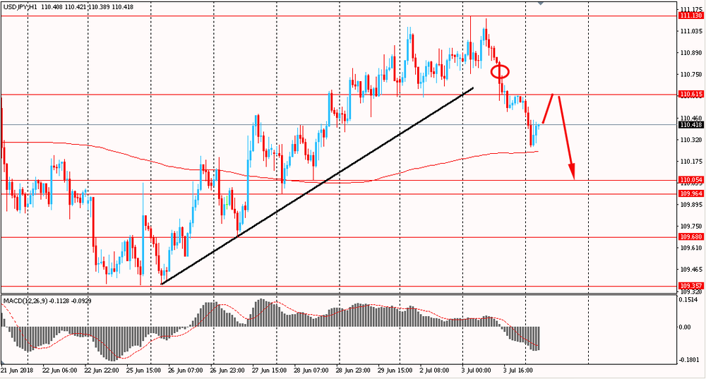 Сегодня утром пара USD/JPY снизилась к Y110.25, продолжая вчерашнее падение. Во вторник пара нащупала сильный уровень сопротивления около 2-х месячных максимумов, после чего начала снижаться и закрыла день существенно в минусе. На данный момент USD/JPY сумела пробить и закрепиться ниже наклонной линии поддержки от 26 июня. Помимо этого, пара опустилась к линии скользящей средней MA 200 H1 и на данный момент тестирует данную поддержку. Если медведям удастся закрепиться ниже мувинга, медведи окончательно завладеют ситуацией.