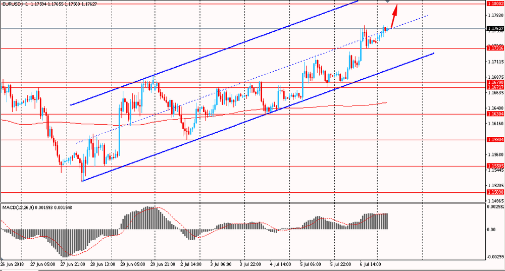 Пара EUR/USD сегодня утром выросла к $1.1765, продолжая пятничный подъем. В последний день прошлой торговой недели пара, оттолкнувшись от линии поддержки канала, выросла и закрыла день на положительной территории. На данный момент евро все еще торгуется в рамки общего восходящего канала от 28 июня и находится около его срединной линии. Евро по-прежнему торгуется выше линии скользящей средней MA 200 H1. Скорее всего быки будут пытаться продолжить общий подъем и закрепить свои позиции выше срединной линии канала.