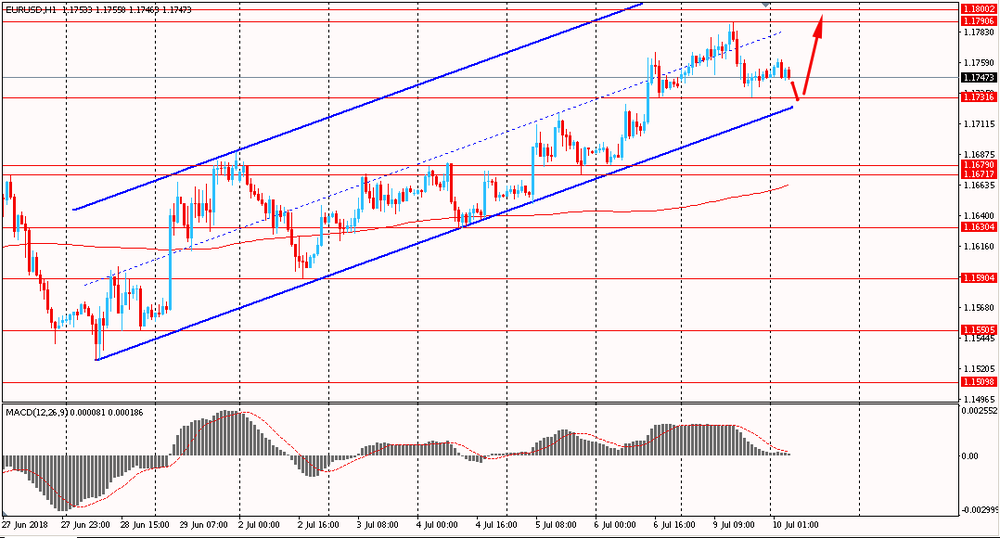 Пара EUR/USD сегодня утром торговалась в диапазоне $1.1745-60. Вчера пара в первой половине дня выросла, однако, встретив сопротивление около срединной линии восходящего канала, начала снижаться и закрыла день около цены открытия. На данный момент евро продолжает коррекцию и приближается к линии поддержки глобального восходящего тренда от 28 июня. Есть вероятность, что здесь пара может найти поддержку и продолжить аптренд. Евро по-прежнему торгуется выше линии скользящей средней MA 200 H1.