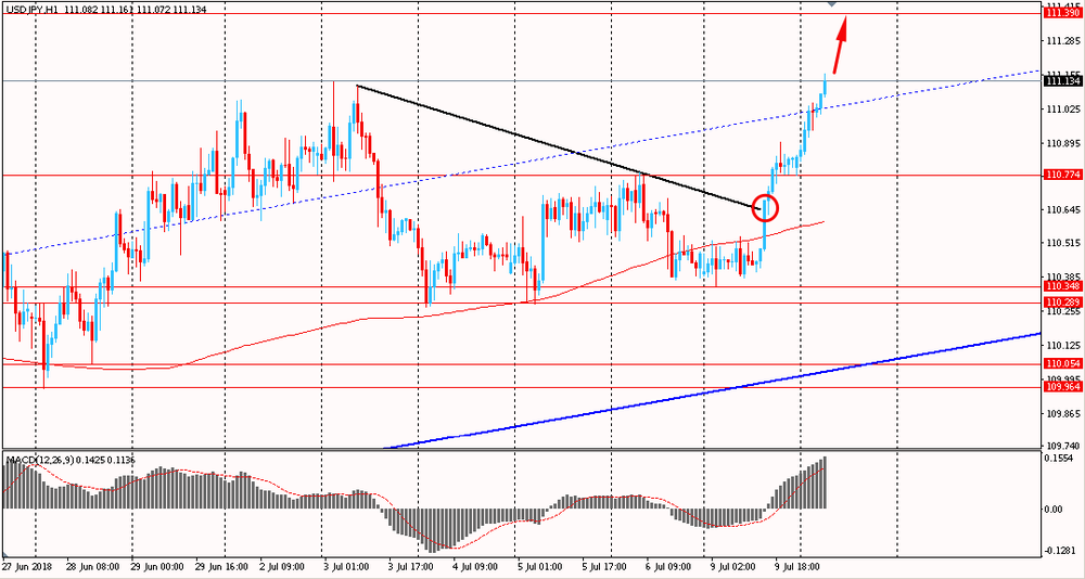 Сегодня утром пара USD/JPY выросла к Y111.15, продолжая вчерашний подъем. В понедельник пара, найдя поддержку около линии скользящей средней MA 200 H1, резко выросла и закрыла день на положительной территории, пробив и закрепившись выше сопротивления от 3 июля. На данный момент пара пытается закрепиться выше срединной линии общего восходящего канала на 4-х часовом графике. Быки полностью вернули себе превосходство и будут развивать успех в рамках глобального аптренда.