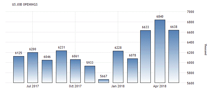 Обзор вакансий и текучести рабочей силы (JOLTS), опубликованный Бюро статистики труда США, показал, что в мае число вакансий снизилось до 6,638 млн. Между тем, показатель за апрель был пересмотрен в сторону повышения - с 6,698 млн. до 6,840 млн. (новый рекордный максимум). . Аналитики ожидали, что число вакансий снизится до 6,583 млн. Уровень вакансий составил 4,3 процента, уменьшившись на 0,1 процента относительно апреля. Количество вакансий уменьшилось в частном секторе (-228 000), и мало изменилось и в правительственном сегменте. Что касается отраслей, количество вакансий увеличилось в федеральное правительство (+12 000) и горнодобывающей промышленности и лесозаготовок (+10 000), но сократилось в секторе информации (-60 000) и сегменте искусств, развлечений и отдыха (-27 000)