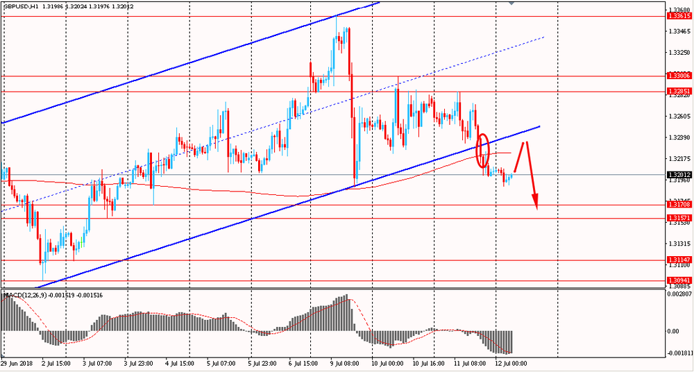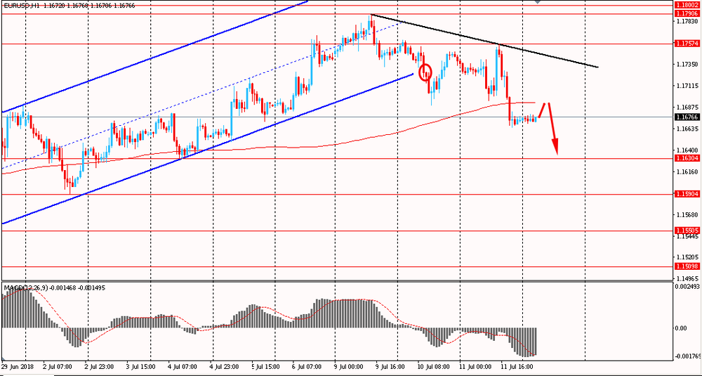 Пара EUR/USD сегодня утром торговалась в диапазоне $1.1670-80, находясь около вчерашних минимумов. В среду пара, оттолкнувшись от линии сопротивления от 9 июля, упала и закрыла день на отрицательной территории. На данный момент евро пробило линию скользящей средней MA 200 H1, и пытается закрепиться ниже данного уровня. Ранее пара вышла из общего восходящего тренда. Пока евро будет находится ниже сопротивления от 9 июля - необходимо придерживаться медвежьего сценария.