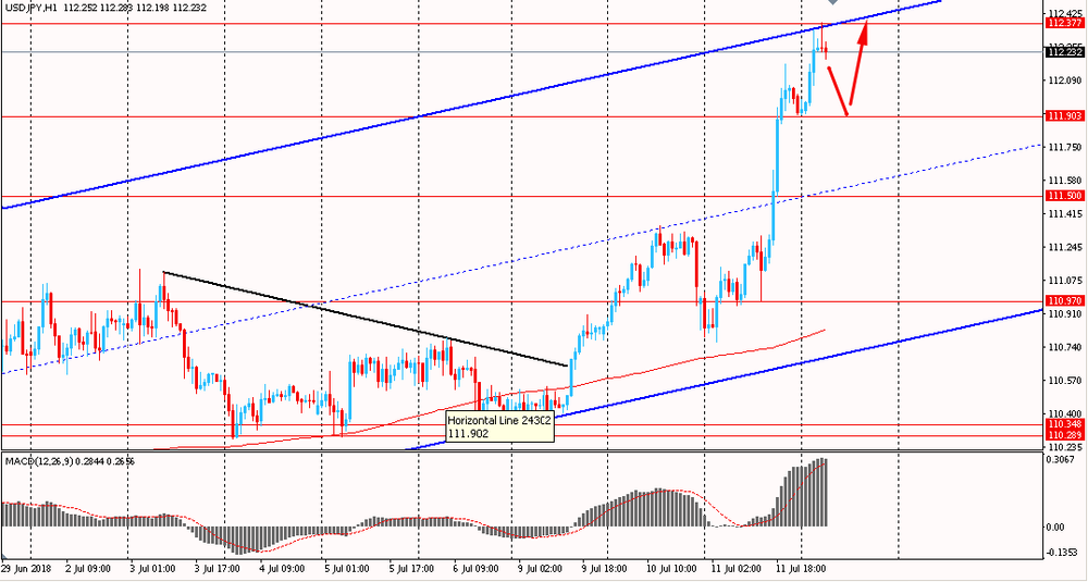 Сегодня утром пара USD/JPY выросла к Y112.35, продолжая вчерашнее ралли. В среду пара, оттолкнувшись от линии поддержки скользящей средней MA 200 H1 выросла и закрыла день очень сильным подъемом. На данный момент пара торгуется около наклонной линии сопротивления глобального восходящего канала на 4-х часовом графике. USD/JPY все еще находится существенно выше линии скользящей средней MA 200 H1, а значит, в целом, быки полностью удерживают превосходство и будут развивать успех в рамках глобального аптренда.