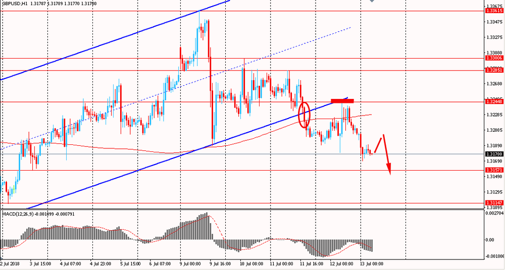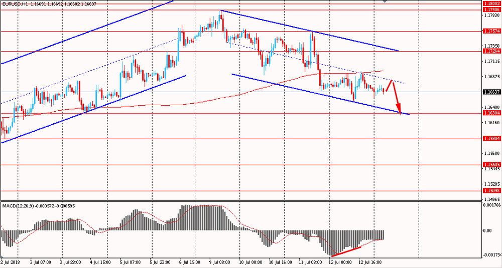 Пара EUR/USD сегодня утром торговалась в диапазоне $1.1650-70, находясь около вчерашних минимумов. В четверг пара находилась под давлением и закрыла день с небольшим понижением. На данный момент евро все еще находится ниже линии скользящей средней MA 200 H1 и ниже наклонной линии общего нисходящего канала от 9 июля. Пока евро будет находится ниже данного сопротивления - необходимо придерживаться медвежьего сценария. Стоит отметить, что на часовом графике сформировалась небольшая бычья дивергенция по индикатору MACD, что сигнализирует о возможном формирование глубокой коррекции или развороте цен.