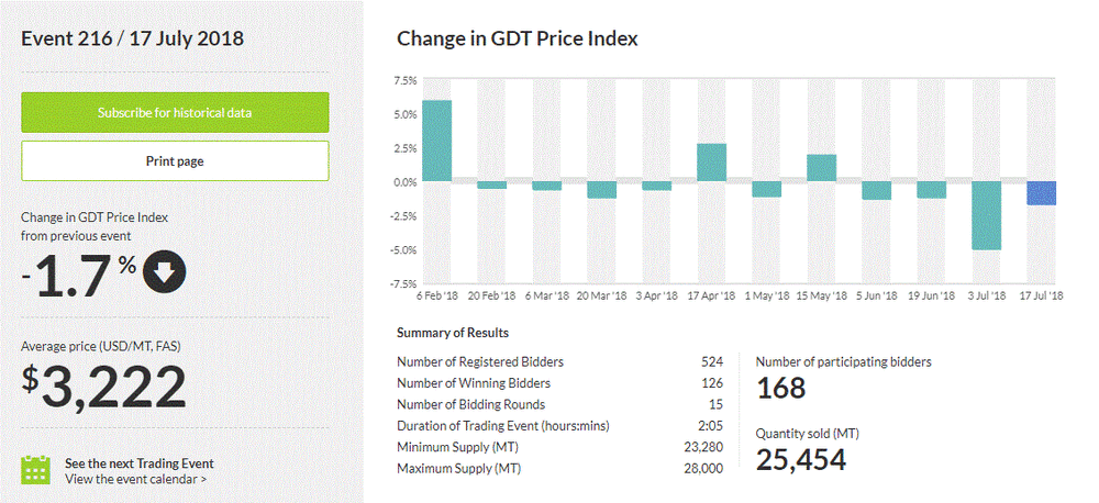 Как стало известно, стоимость молочной продукции уменьшилась на 1,7%, до $3 222 за метрическую тонну после того, как упала на 5,0% в ходе предыдущего аукциона. Результаты аукциона также показали, что стоимость цельного сухого молока выросла на 1,5%, до $2 973 за метрическую тонну после снижения на 7,3% в ходе предыдущего аукциона. Тем временем, цена обезжиренного сухого молока увеличилась на 0,8%, до $1 959 за метрическую тонну после того, как снизилась на 4,6% в ходе предыдущего аукциона.