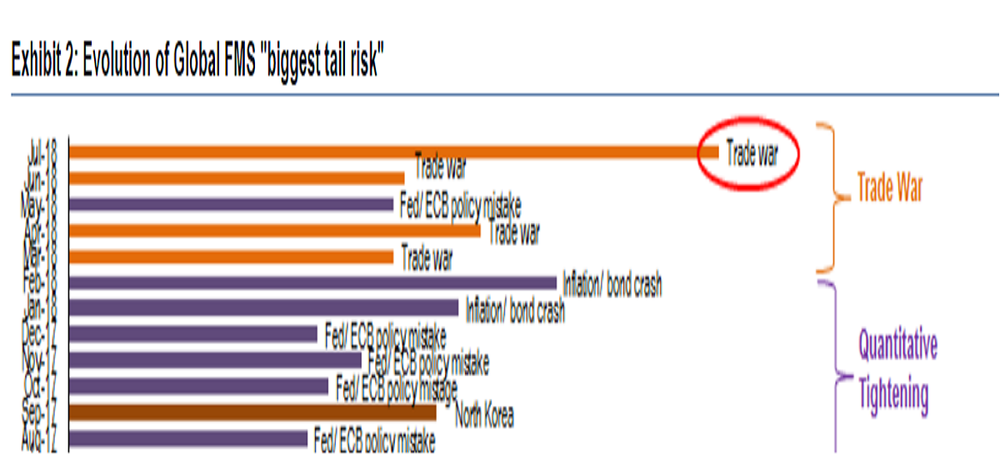 Торговая война теперь явно доминирует как крупнейший известный неизвестный источник потенциального спада для инвесторов во всем мире, согласно июльскому опросу менеджеров глобальных фондов, проведенному Bank of America Merrill Lynch.