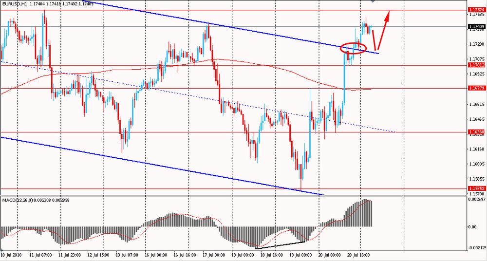 Пара EUR/USD сегодня утром выросла к $1.1750, продолжив пятничное ралли. В последний день прошлой торговой недели пара, оттолкнувшись от срединной линии нисходящего канала, резко выросла и смогла закрыть день сильным ростом. Более того, евро пробил и закрепился выше линии скользящей средней MA 200 H1. На данный момент пара за рамки общего нисходящего тренда от 9 июля, и сейчас пытается закрепиться выше его уровня сопротивления. В любом случае, пока пара находится выше данного сопротивления, лучше присматриваться к покупкам.
