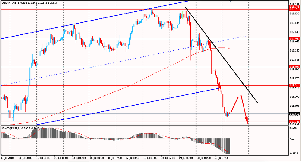 Сегодня утром пара USD/JPY упала к Y110.75, продолжая пятничное снижение. В последний торговый день прошлой недели пара, преодолев срединную линию восходящего канала, упала и закрыла торговый день существенным снижением. Более того, USD/JPY пробила и закрепилась ниже линии скользящей средней MA 200 H1. На данный момент пара вышла за рамки общего восходящего тренда от 7 июня на четырехчасовом графике и продолжает падать. Пока пара торгуется ниже MA 200 H1 и линии сопротивления 2-х последних торговых дней, есть смысл искать точки входа на продажи.
