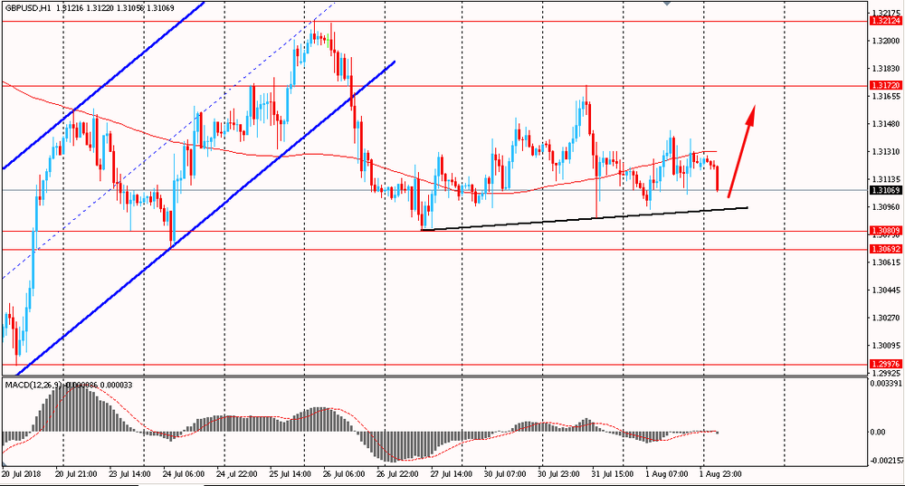 Пара GBP/USD сегодня утром немного снизилась к $1.3105. Уже четыре дня подряд пара торгуется в узком диапазоне, без существенных изменений, и закрывает дни около цен открытия. Фунт находится в коррекции после резкого снижения 26 июля. На данный момент пара тестирует на прочность линию скользящей средней MA 200 H1. Пока пара находится в данной консолидации можно присматриваться к покупкам пары, но с короткими целями. Однако, если британская валюта пробьет линию поддержки последних 4-х торговых дней от 27 июля, необходимо будет открывать продажи.