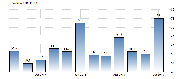 Согласно представленным данным, индекс, оценивающий экономические условия в секторах производства и услуг для компаний, зарегистрированных в Нью-Йорке, вырос в июле до 75,0 пункта с 55,0 пункта в июне. Это было первое повышение за последние три месяца. Прогнозировалось, что индекс вырастет лишь до 59,4 пункта. Напомним, значение выше 50 пунктов говорит о расширении активности. Вместе с тем, индекс, отражающий экономические условия через 6 месяцев, упал до 77,8 пункта с 78,1 пункта в июне.