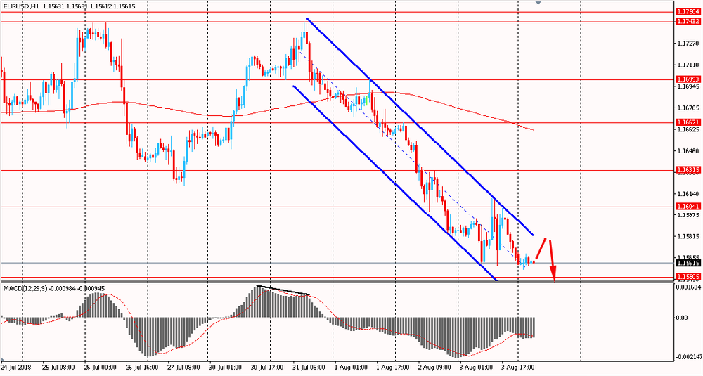 Пара EUR/USD сегодня утром торговалась в диапазоне $1.1555-65, оставаясь около пятничных минимумов. В последний день прошлой торговой недели пара, оттолкнувшись от линии сопротивления нисходящего канала от 31 июля, упала и закрыла очередной день на отрицательной территории. На данный момент единая валюта продолжает оставаться под давлением и удерживается ниже линии скользящей средней MA 200 H1. Евро находит в нисходящем даунтренде. Стоит отметить, пока пара будет торговаться ниже MA 200 H1, логичным будет присматриваться к продажам евро на коррекциях.