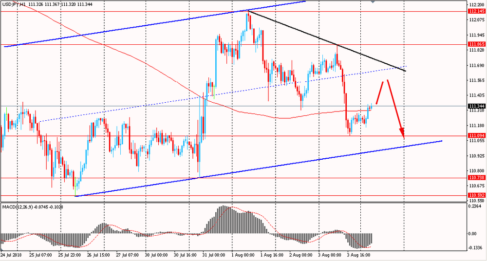 Сегодня утром пара USD/JPY немного выросла к Y111.35, восстанавливаясь после пятничного обвала. В последний день прошлой торговой недели пара резко упала и закрыла день на отрицательной территории. На данный момент пара тестирует линию скользящей средней MA 200 H1 и пытается закрепиться ниже данного мувинга. С 1 августа пара находится в нисходящем движении и пока торгуется ниже линии сопротивления последних 3-х дней, есть смысл присматриваться к продажам пары. Однако, стоит помнить, что на 4-х часовом графике USD/JPY находится в глобальном восходящем канале. Поэтому продажи необходимо открывать с короткими целями.