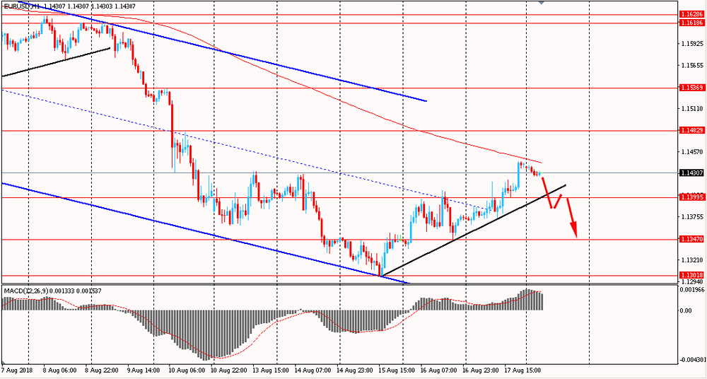 Пара EUR/USD сегодня утром торговалась в диапазоне $1.1425-40, продолжая оставаться около недельных максимум. В пятницу евро снова выросло и сумело закрыть день небольшим подъемом. На данный момент единая валюта продолжает корректироваться и закрепилось выше срединной линии глобального даунтренда. Тем не менее, стоит понимать, что пара торгуется ниже линии скользящей средней MA 200 H1 в общем нисходящем канале от 31 июля. В текущей ситуации наиболее уместным будет искать новые возможности для продажи на окончание коррекции, после пробоя линии поддержки от 15 августа.